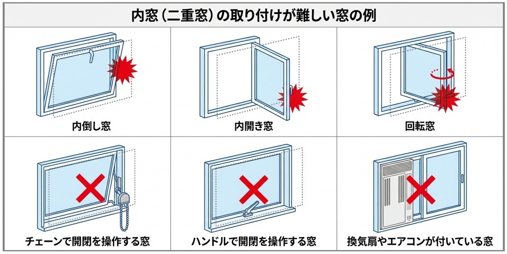 すべての窓が二重窓にできるわけではありません。外側の窓の開き方や窓枠の状況によっては、内窓を取り付けられない場合があります。