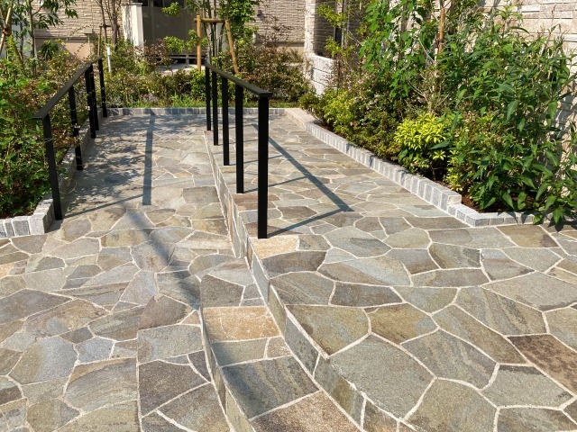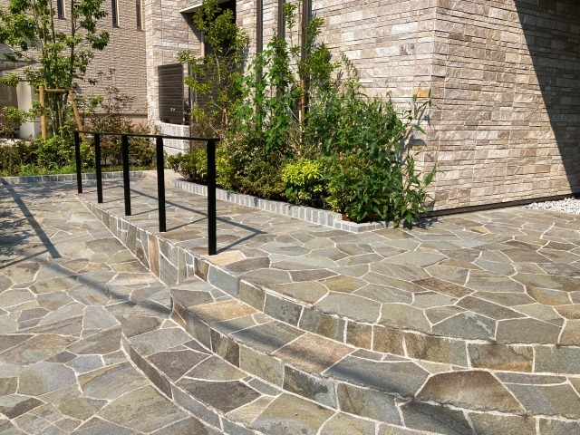 アプローチの仕上げには多様な素材が使われますが、見た目のデザイン性だけでなく、滑りにくさや手入れのしやすさといった安全性・メンテナンス性も重要なポイントです。