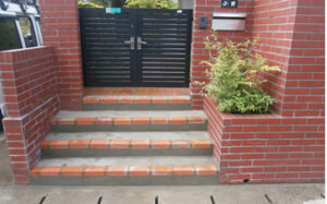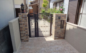 - 袖壁と階段の立ち上がりに使用したアンティークレンガと、門扉のデザインを統一
