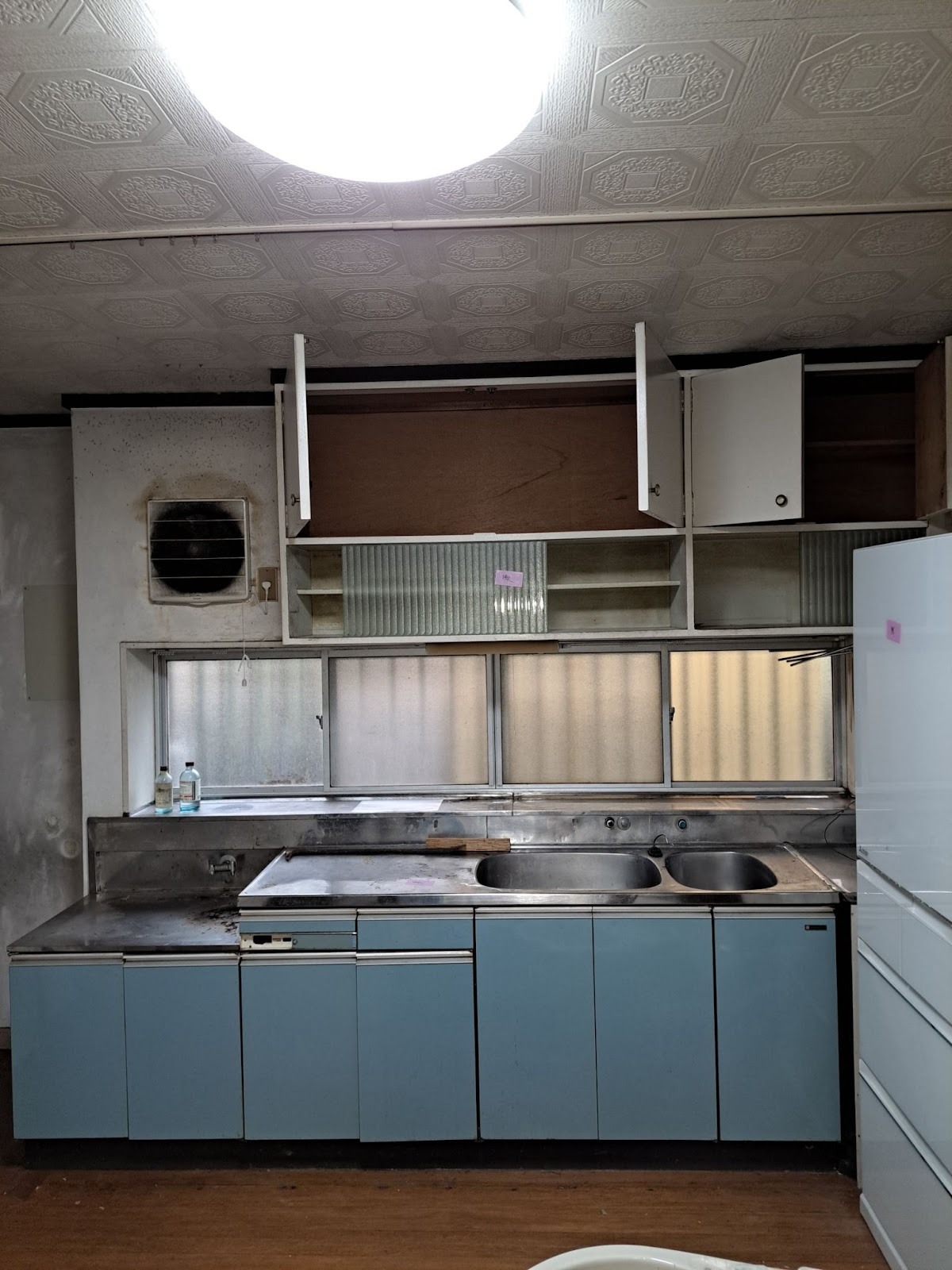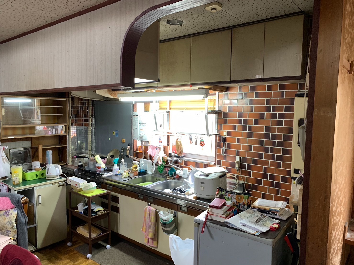 既存のキッチンは壁付けタイプで、調理中は常に壁に向かって作業するスタイルでした。吊戸棚や換気扇まわりには長年の汚れが蓄積し収納も古い造りのため出し入れが不便。暗く閉鎖的な空間で「家族と会話を楽しめるキッチンにしたい」というご要望がありました。