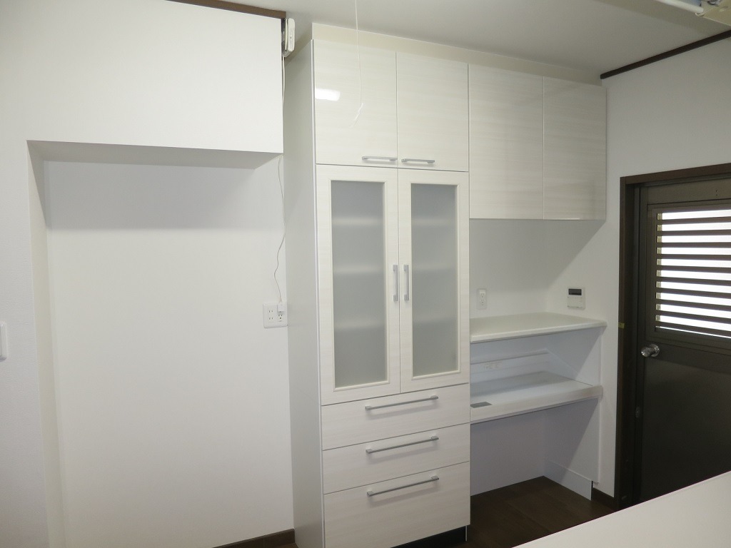 - 背面には収納付きカップボードも設置し、調理器具や食器をすっきり収納可能に