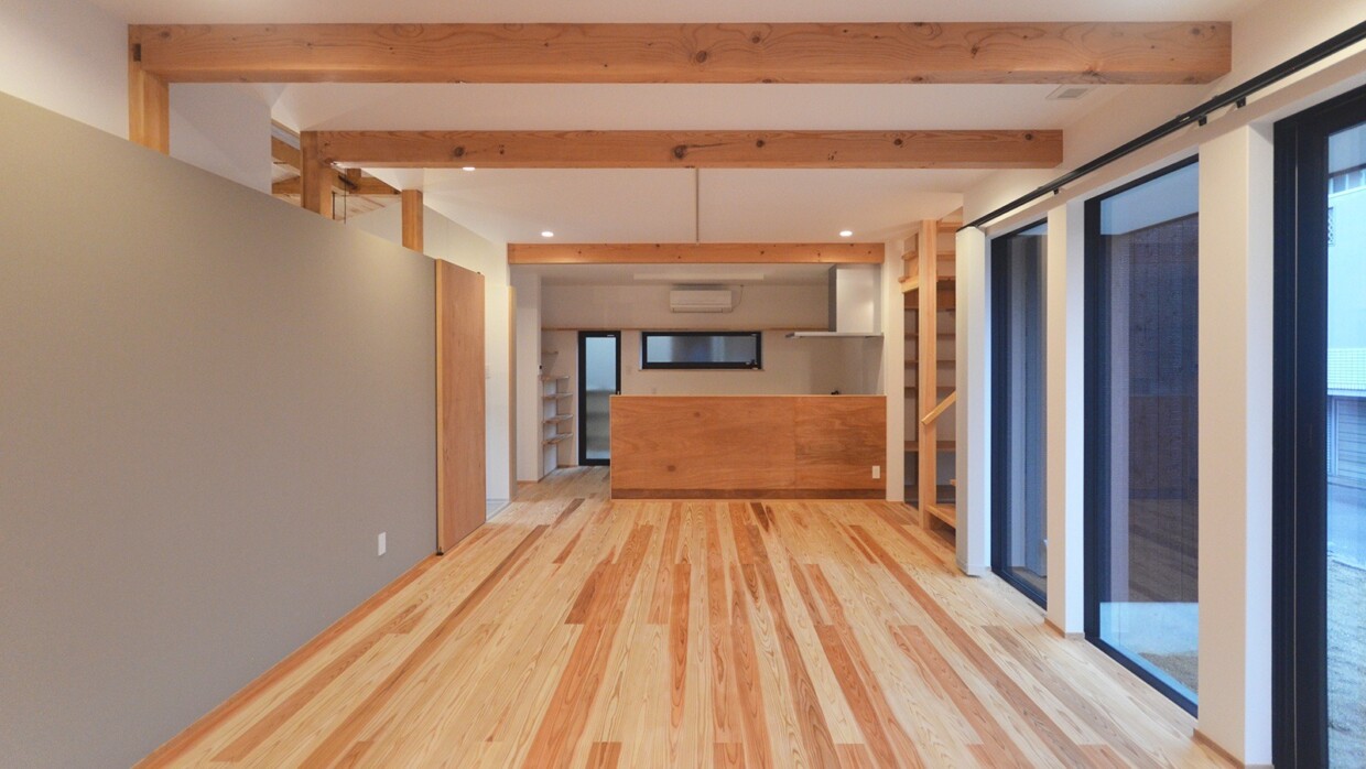 リフォーム後は壁や間仕切り(部屋と部屋を区切るための壁)を撤去し、天井の梁(はり)を露出させるデザインにしました。天然木の床材も、空間のぬくもりを際立たせています。