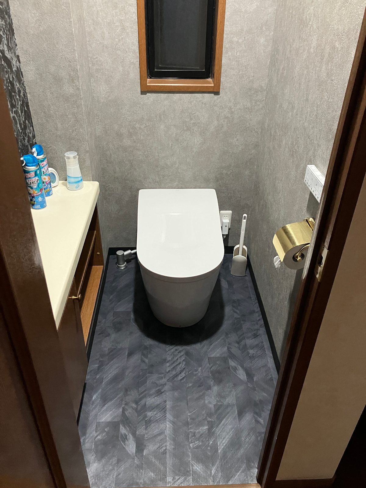 床や壁の色を変更し、落ち着いた高級感のあるホテルライクな空間へ。濃いグレーの床材と、落ち着いたグレージュの壁紙を選定し、光沢のあるピカピカのタンクレストイレと組み合わせました。さらに、タンク付きのトイレからタンクレストイレに変更したことでトイレ空間も広くなっています。
