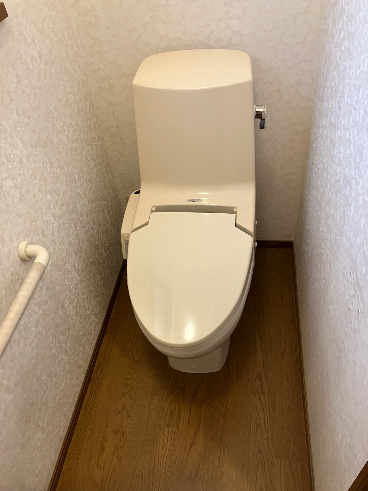 便器と温水洗浄便座(ウォシュレット)、そして手すりを新しくし、壁のクロスと床材も貼り替えたことで、気持ち良く利用できるようになったとのお声です。
