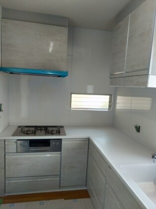 【滋賀県守山市】L型キッチンリフォーム施工事例|人造大理石天板とスライド収納で明るく使いやすく